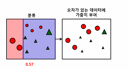 - 오류 데이터에 높은 가중치 부여, 올바른 데이터에는 낮은 가중치 부여0.