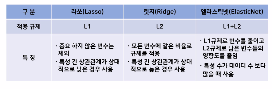 - 하이퍼파라미터(강도(alpha), L1, L2 선택하는 비율)