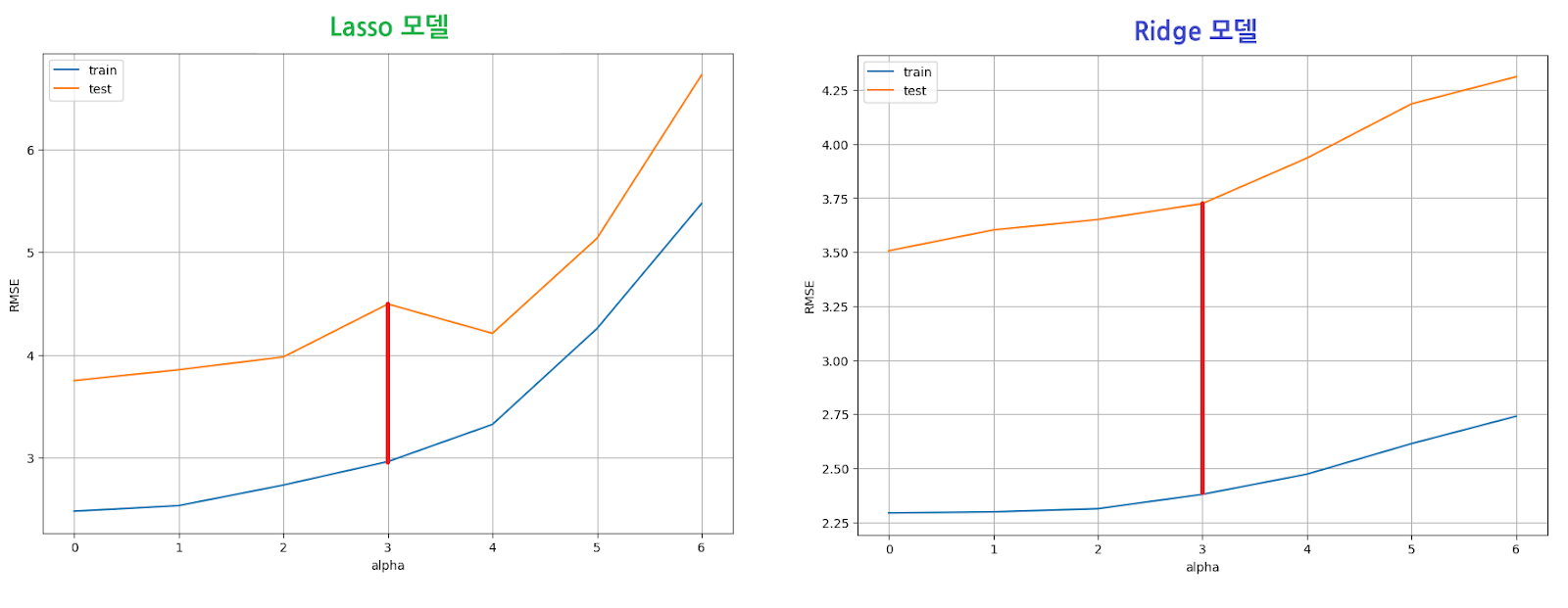 #Lasso모델이 Ridge모델보다 train 데이터와 test 데이터의 RMSE값의 차이가 적다->Lasso 모델이 과대적합 제어에 더 유리하다