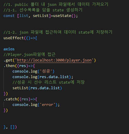 - json 파일에 접근하여 선수데이터를 state에 저장(useEffect, axios 활용)