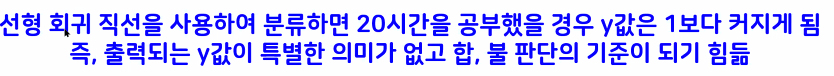 선형분류모델은 값이 커질수록 직선이 늘어나 값의 좌표가 달라지면서 0과 1 사이의 범위를 벗어나 구분선 위에 위치할지 아래에 위치할지 모르기 때문에 합불 여부가 불확실해짐