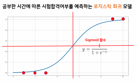 로지스틱 회귀모델: Sigmoid 함수를 사용하면 아무리 작은 수여도 0에 가깝게, 아무리 큰 수여도 1에 가깝게 조정하여 값을 0과 1사이의 확률정보로 표시. 값이 커지거나 작아져도 기준선에 따라 합불 여부를 판단할 수 있음