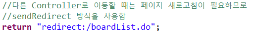 - 다른 Cotroller로 이동할 때는 Redirect 방식 사용