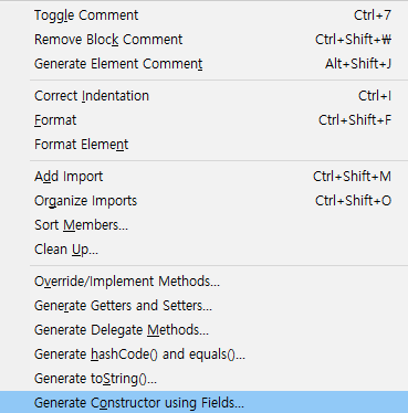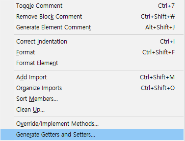 Alt+Shift+S: 기본/전체생성자 및 Getter, Setter 만들기