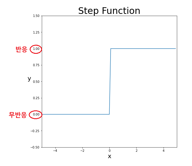 1)Step function(계단함수): 퍼셉트론에 활용되는 활성화 함수. X값이 0 이하면 y는 0(무반응), 0을 초과하면 1(반응)