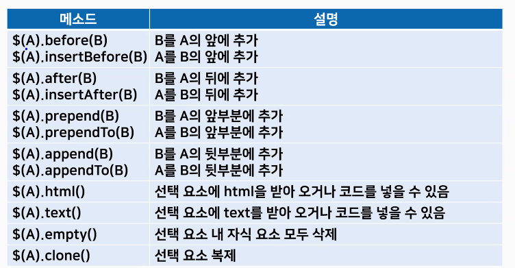Element 조작 메소드 prepend(): 대상 태그 안에서 앞에 추가 append():대상 태그 안에서 뒤에 추가 after(): 대상 태그 뒤에 추가 2. Element 접근 메소드 [실습1]입력값에 따라 관련 이미지 출력하기 3. 애니메이션 효과: animate({css 속성: 값}), 애니메이션 실행시간, 이징종류); -애니메이션 실행시간: ms(밀리세컨드) 단위 예)1초=1000; -이징(easing): 애니메이션 효과의 변화 속도 [AJAX] AJAX(Asynchronous JavaScript and XML) -필요한 데이터만 웹서버에 요청해서 받은 후 -비동기 통신: 요청을 처리하는 중에도 다른 작업 처리 가능 -동기 통신: client가 서버에 요청하고 서버의 응답이 올 때까지 다른 작..