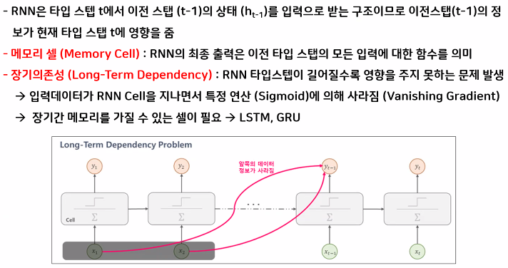 - 단점: 처음 시작한 Weight값이 학습이 될수록 1보다 작은 값이 곱해져 상쇄됨(Vanishing Gradient Problem), 즉 중요한 데이터가 시간이 지날수록 데이터가 사라짐