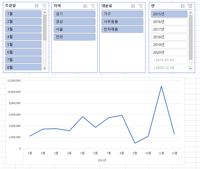 차트 제목, 범례 등을 지워 간소화해준다. 이제 슬라이서에서 필터링할 때마다 차트가 자동으로 변경된다.