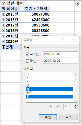 월별 매출이기 때문에 우측 마우스-그룹화를 클릭하여 월, 연을 단위로 선택해 월별 구매액이 보이게 한다.