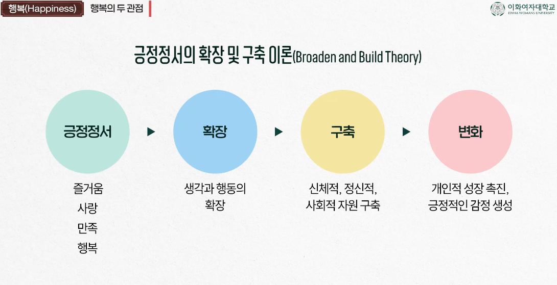 긍정정서로 생각과 행동이 확장되어 신체적, 정신적, 사회적 자원을 구축하고 개인적 성장을 촉직하고 긍정적인 감성을 생성