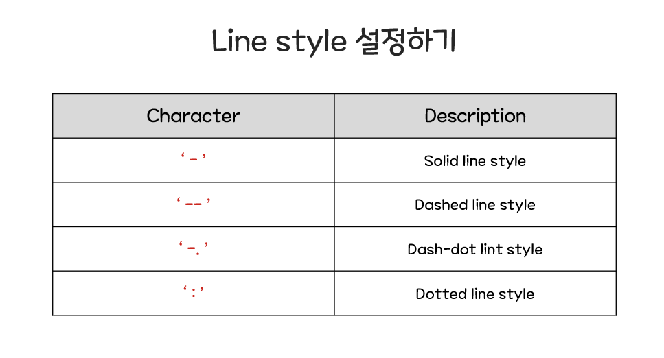 - 선 스타일(line style) 설정:ls='모양' 예)plt.plot(x,y,ls='-.')