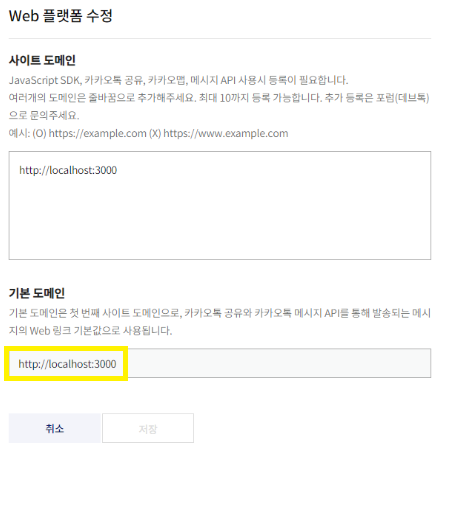 - 내 애플리케이션-등록한 애플리케이션-웹사이트 주소 수정: localhost 주소로 변경(http://localhost:3000)