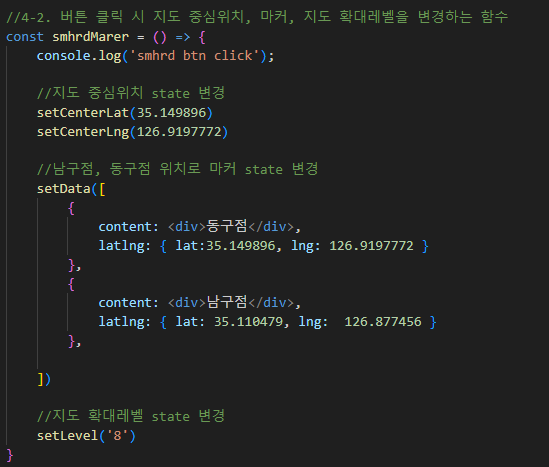 - 버튼 클릭 시 지도중심위치, 마커, 지도확대레벨을 변경하는 함수