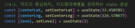 - 스마트인재개발원 위치와 지도확대레벨을 관리할 state 생성