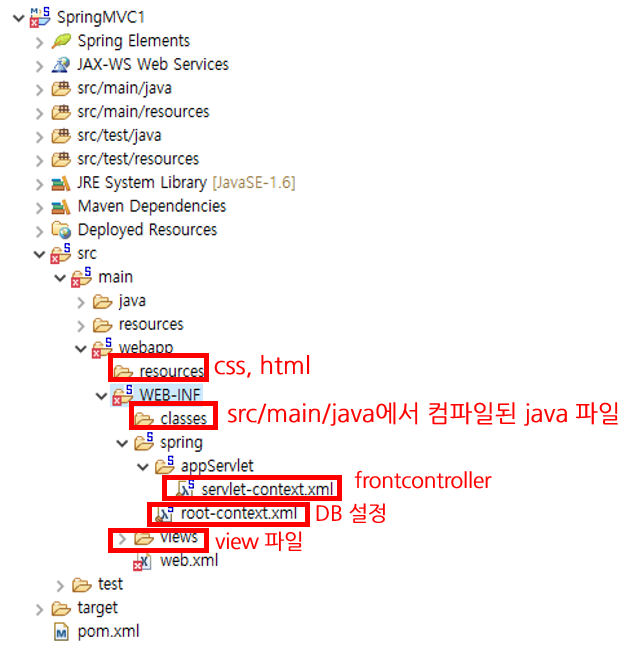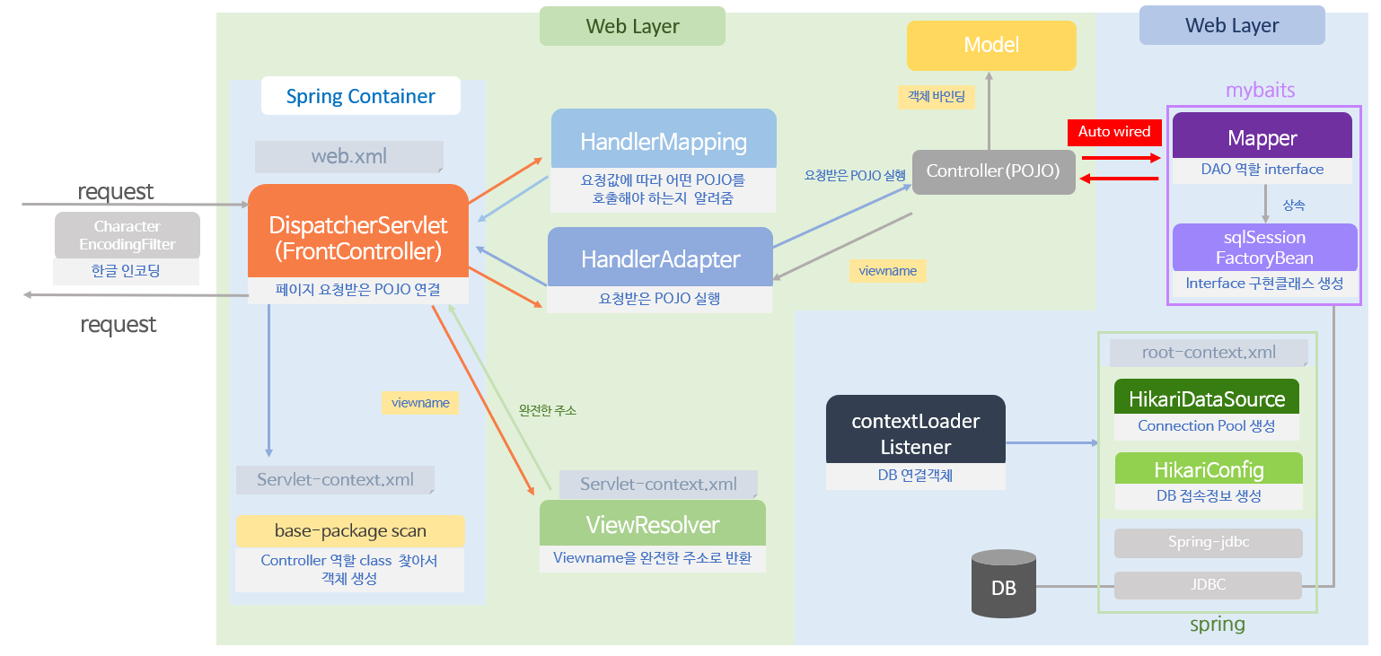 - DispatcherServlet: Front Controller와 같은 역할, [servlet-context.xml]파일을 읽고 POJO로 연결시킴