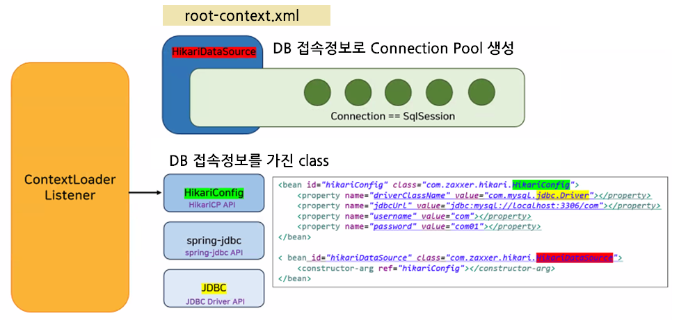 - DB 연결 부분→Spring에서 HikariCP가 담당(overhead가 적은 성능이 좋은 cp api)