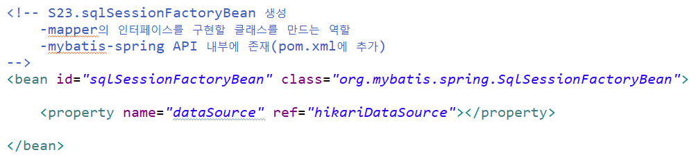 S23.sqlSessionFactoryBean 생성: mapper의 인터페이스가 필요한 구현클래스(DB 연결) 생성