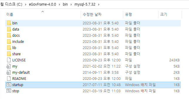 - mysql 서버 구동: C:\eGovFrame-4.0.0\bin\mysql-5.7.32 [startup] 클릭