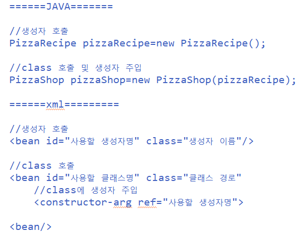 - 클래스 및 생성자 호출: <bean id=”class/생성자명”, “class/생성자 경로”>