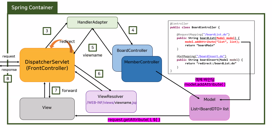 4)객체 바인딩: DB의 정보를 view에서 받기 위해 Model에 객체 바인딩(request과 같은 기능)
