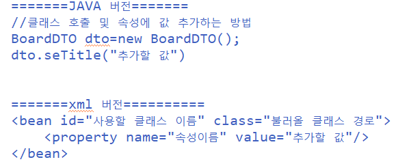 - 속성값 추가: <property name=”속성이름”, value=”속성에 추가할 값”>